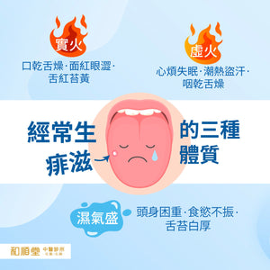 Q:我今年45歲,單身獨居,平日生活算正常,飲食也很節制,很少吃煎炸熱氣食物,中午上班多數到茶餐廳吃碟頭飯,多數點凍奶茶或凍檸茶,晚上回家煮米粉簡簡單單一餐,體型也算不錯,BMI正常,而且每晚11時前便上床睡覺。但不知為何近日經常生痱滋。不知是否身體出現甚麼毛病,或是飲食方面出現甚麼問題,中...