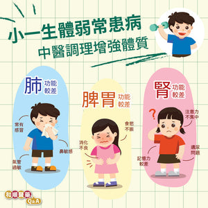 Q:我的兒子 即將6歲,今年升讀小一,但他的身體比較瘦弱,比同齡的孩子矮小,常常被誤會是幼稚園學生。而且他一向有鼻敏感,又經常感冒,升讀小一後功課壓力增大,很擔心他容易病倒影響身體,並影響學業。中醫可以幫他調理改善身體狀況嗎?