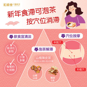 新年喜氣洋洋,聚會頻繁,又是大飽口福的時候。不過盆菜、煎蘿白糕、年糕和不少新年食品都屬油膩食物,不易消化。不少人在大時大節後都會因食滯而感到肚脹或胃部不適等。