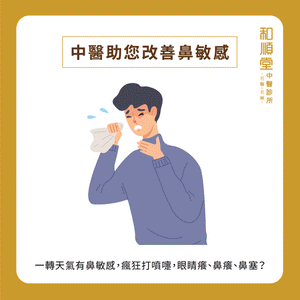 不少朋友轉天氣便會鼻敏感發作,除了天氣轉變外,個人生活及飲食習慣也有關係。若形成了容易鼻敏感的體質,每次發作食用西藥只可暫時減輕流鼻水及打噴嚏,卻未有根治問題。中醫從改善體質着手,標本兼治,就着每個人不同情況進行針對性治療及調理,助病者提升身體機能,擺脫鼻敏感纏擾。